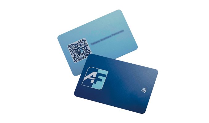 Basta aproximar o cartão de um celular e seus dados serão automaticamente transmitidos. Além da aproximação, há também a opção de leitura por QR Code.