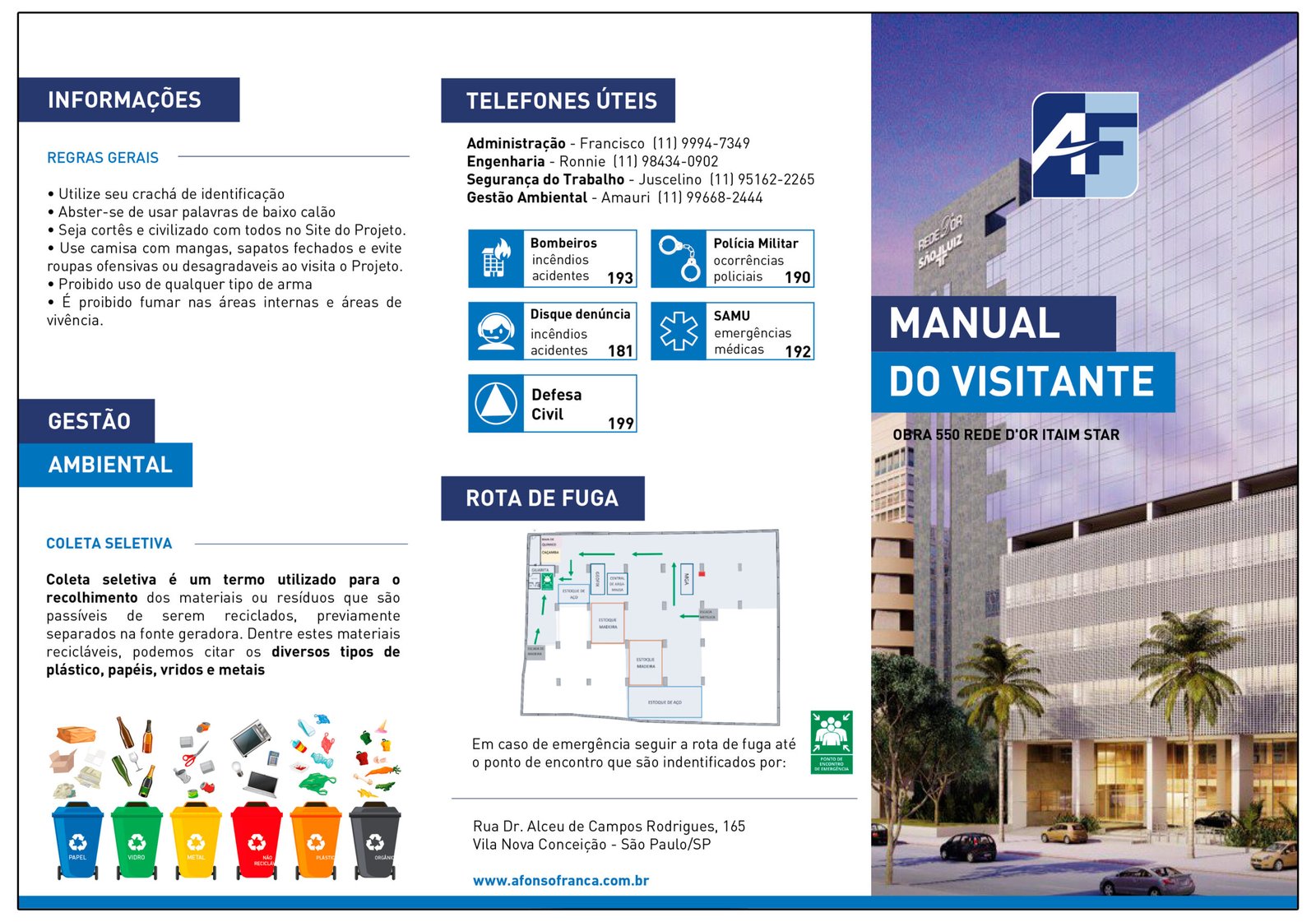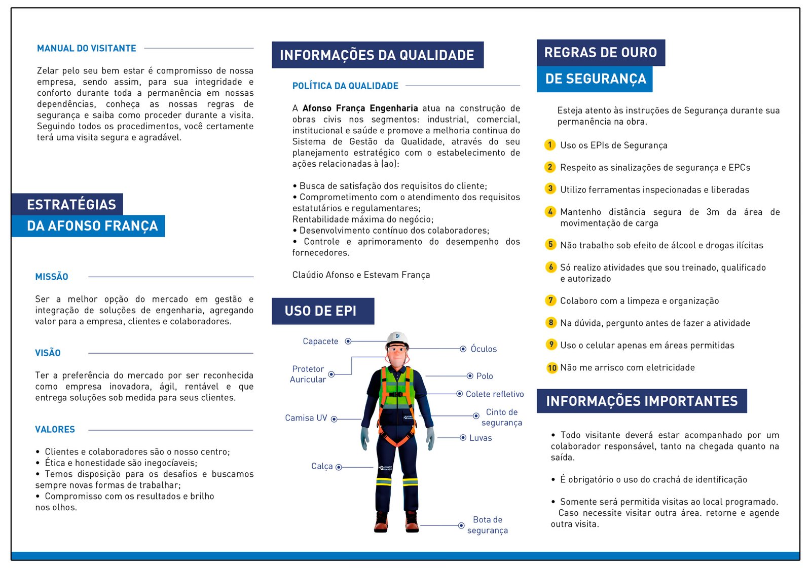 O manual do visitante é um material informativo essencial, apresentado em formato de folder A4 com duas dobras. Ele oferece orientações detalhadas sobre os cuidados necessários que os visitantes devem ter ao acessar o canteiro de obras.