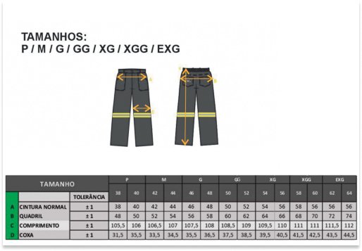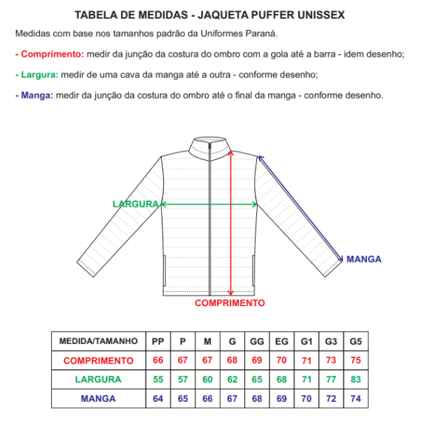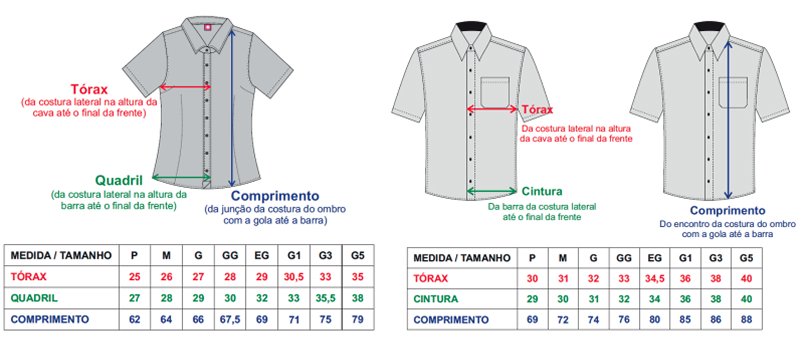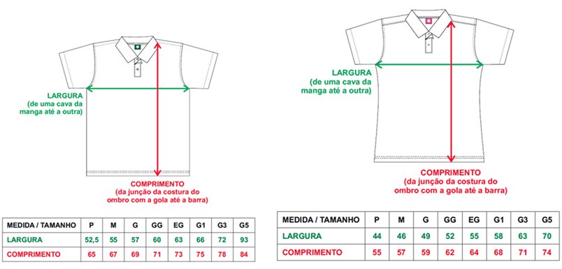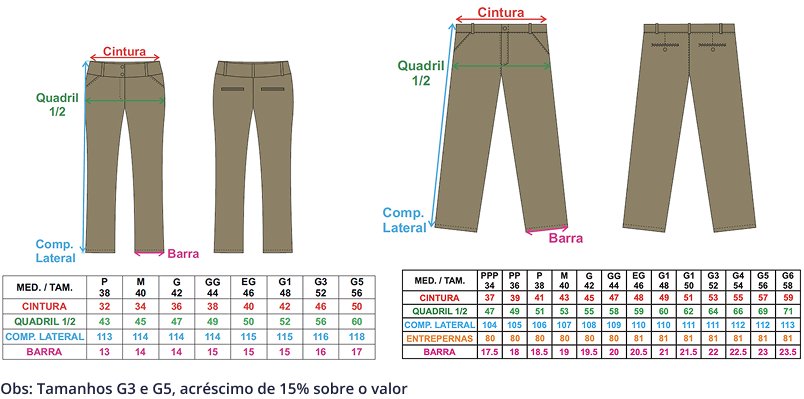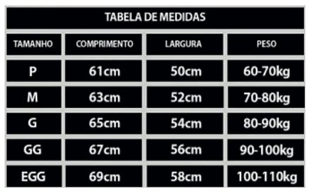 Obs: Tamanhos G3 e G5, acréscimo de 15% sobre o valor