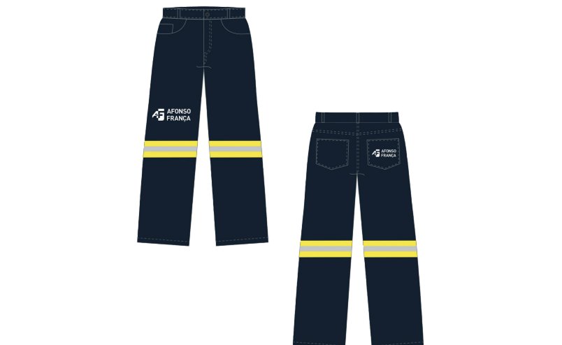Calça jeans 1/2 cós dois bolsos traseiros e dois bolsos frontais chapados, com refletivo amarelo e prata fire, fechamento da braguilha em botões com passantes. 100% algodão. Azul Marinho.