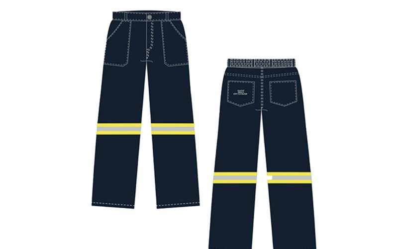 Calça NR10. 1/2 cós dois bolsos traseiros e dois bolsos frontais chapados, com refletivo amarelo e prata fire, fechamento da braguilha em botões com passantes. 100% algodão. Azul Marinho.