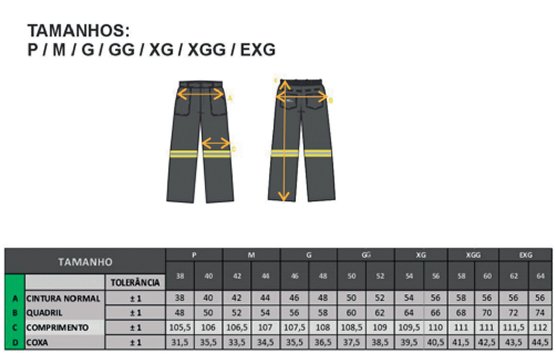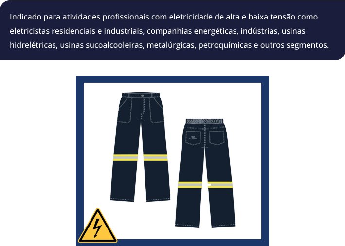 Calça eletricista com identificação do EPI, RISCO E ATPV bordados. Proteção de risco 2, possui proteção contra fogo repentino e arco elétrico. Confeccionado com tecido retardante à chama,100% ALGODÃO.