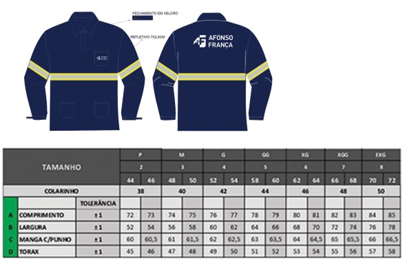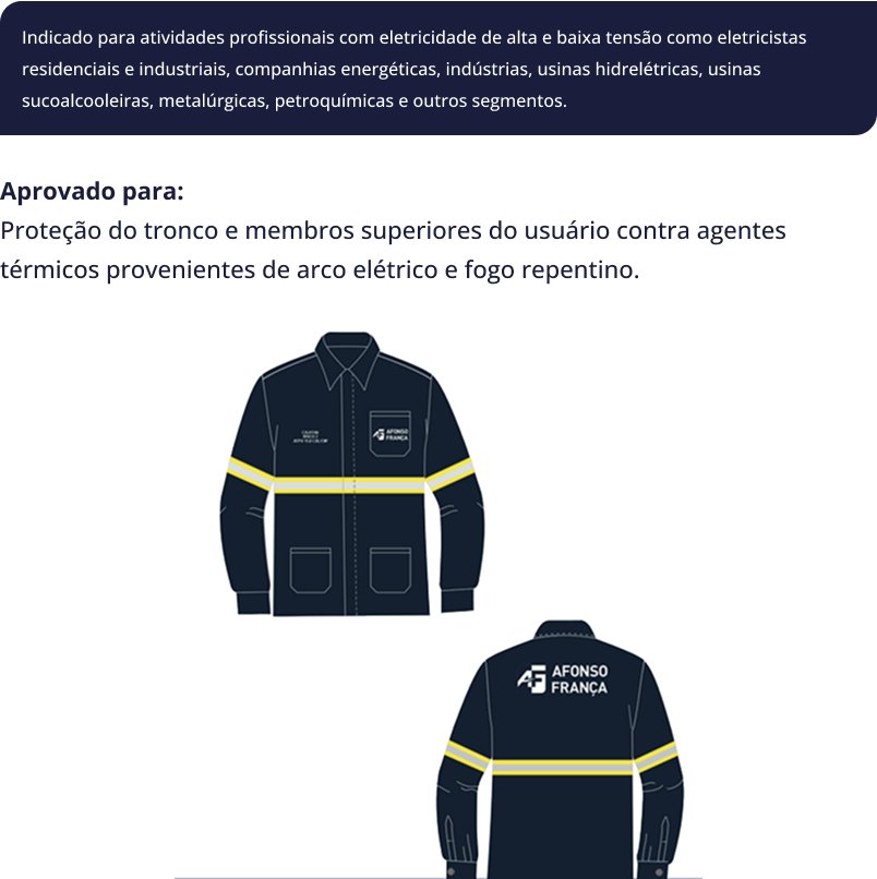 Confeccionada em 100% algodão, com gola em velcro e punhos simples. Faixas refletivas no tórax e mangas, indicada para obras onde o cliente exige o seu uso. Costuras reforçadas, logo bordado no bolso esquerdo e silk nas costas. Resistência, conforto e segurança para ambientes operacionais.