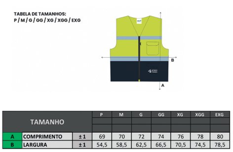 Colete com faixas refletivas e fechamento em zíper. 3 bolsos expansível com tampa fechamento em velcro. Parte inferior Brim 100% algodão e parte superior tactel 100% Poliéster. Amarelo flúor e azul marinho. Logo no bolso inferior lado esquerdo e nas costas.